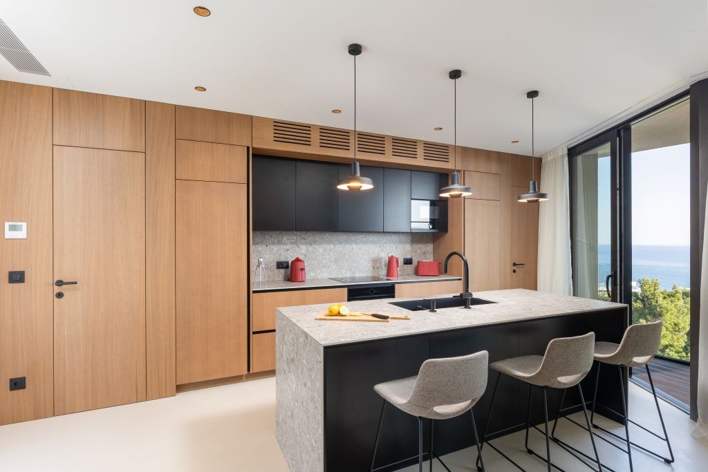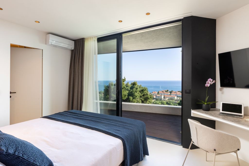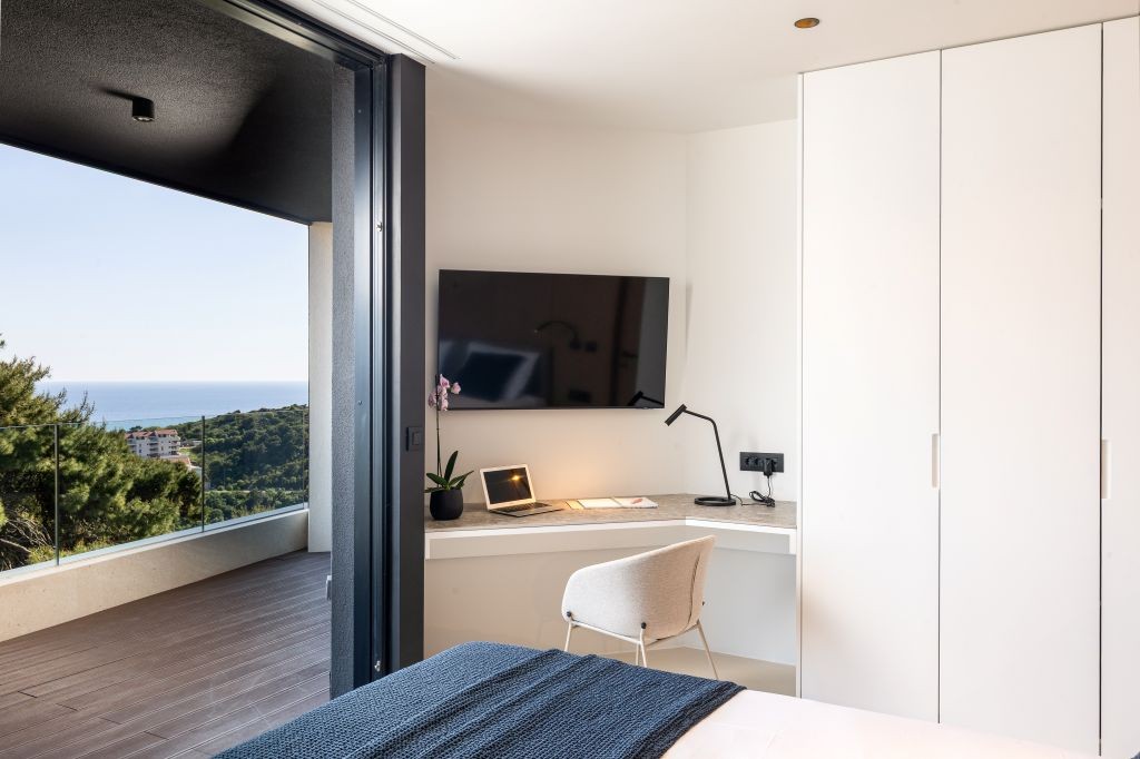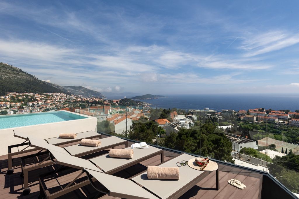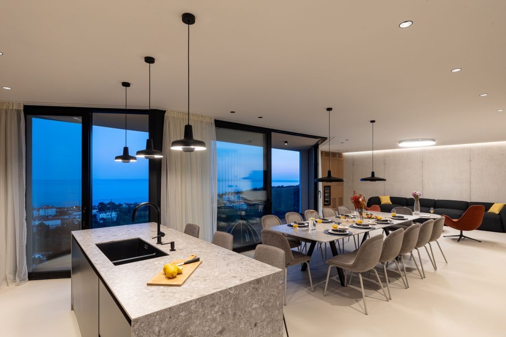 The villa’s crown jewel is its spectacular rooftop terrace, featuring a private infinity saltwater pool – an idyllic setting for cooling off on warm days or stargazing with a backdrop of the Adriatic Sea. The terrace is also equipped with a summer kitchen and a dining area for twelve, perfect for alfresco dining.