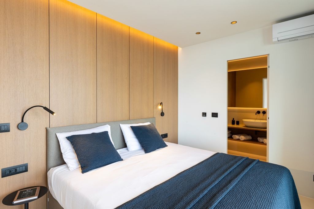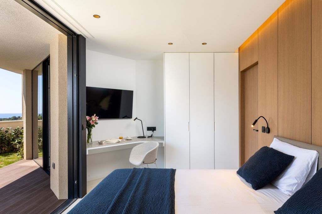 Inside, six spacious bedrooms await, each with en-suite bathrooms, air conditioning, and panoramic sea views. Elegant Ceppo di Gre porcelain finishes add refined detail in the bathrooms and kitchen.