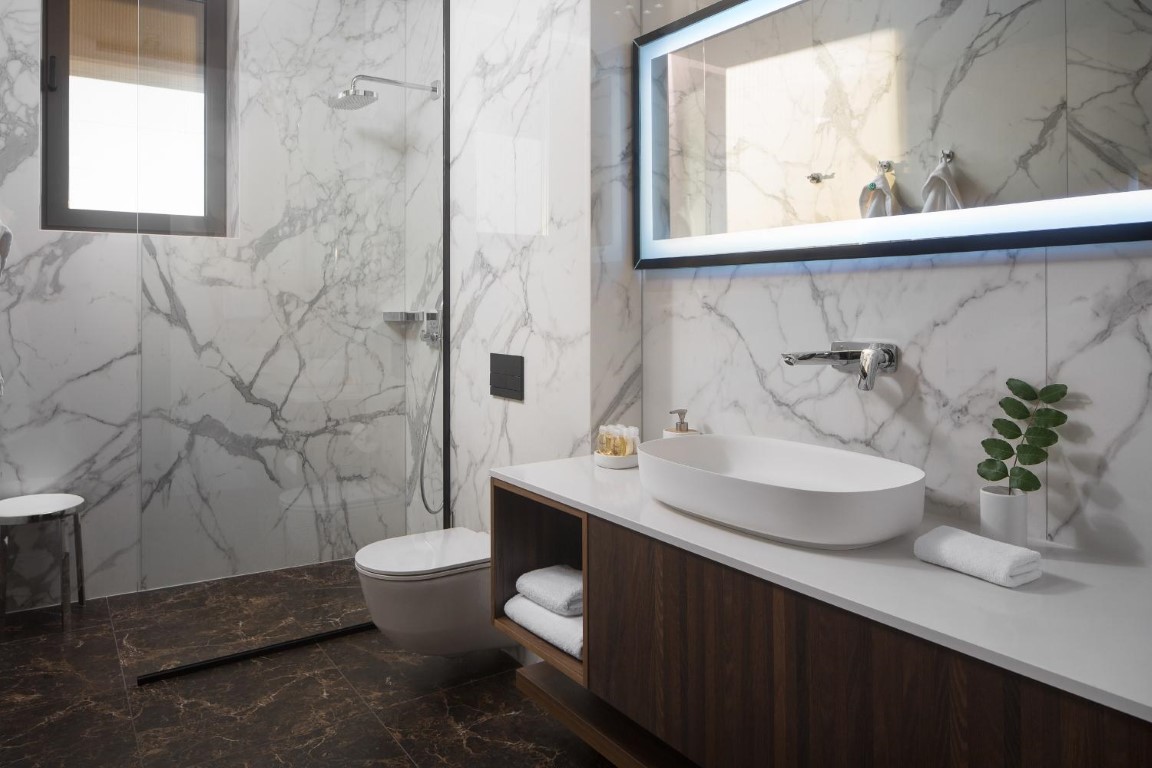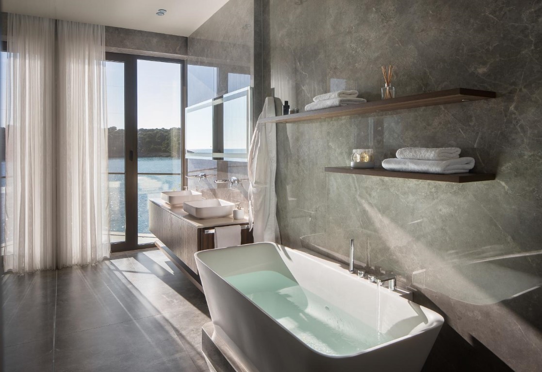 Upstairs, you’ll find all five bedrooms: four with king-size beds, en-suite bathrooms, and flat-screen TVs, and one bedroom with twin beds, ideal for families. The villa is designed to maximize comfort while maintaining a minimalist aesthetic in perfect harmony with its stunning coastal setting.