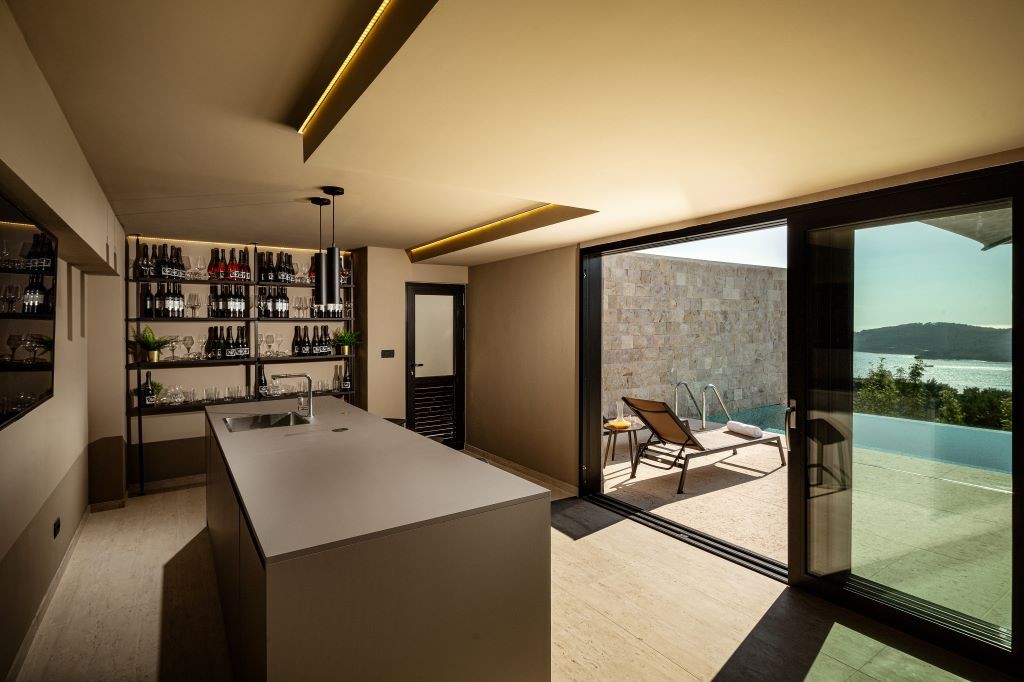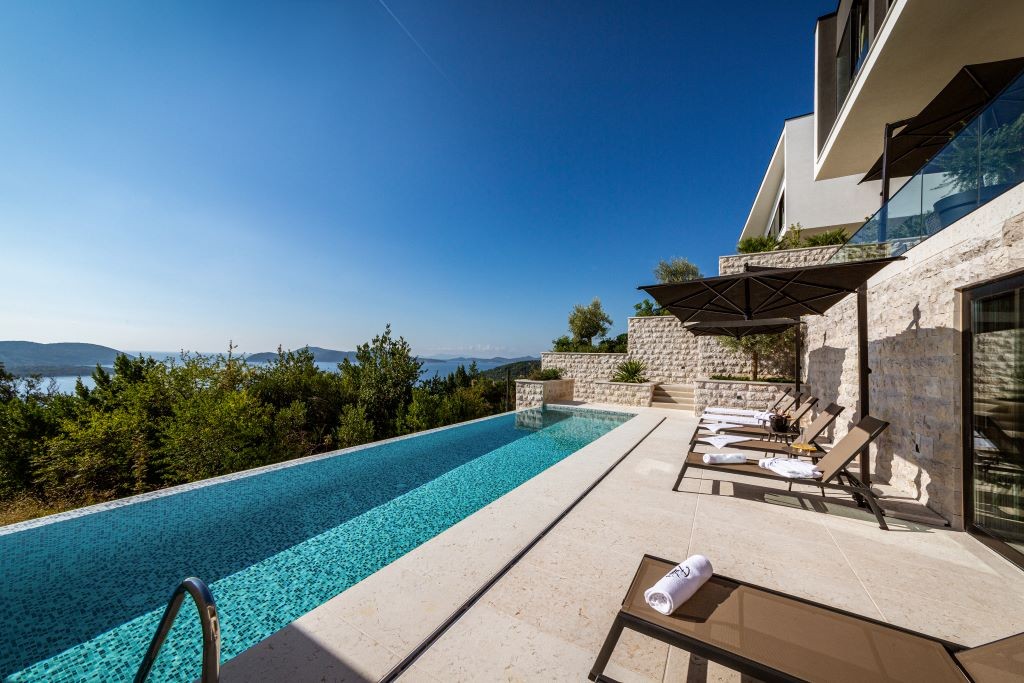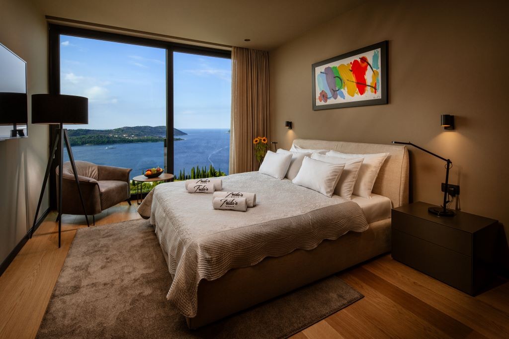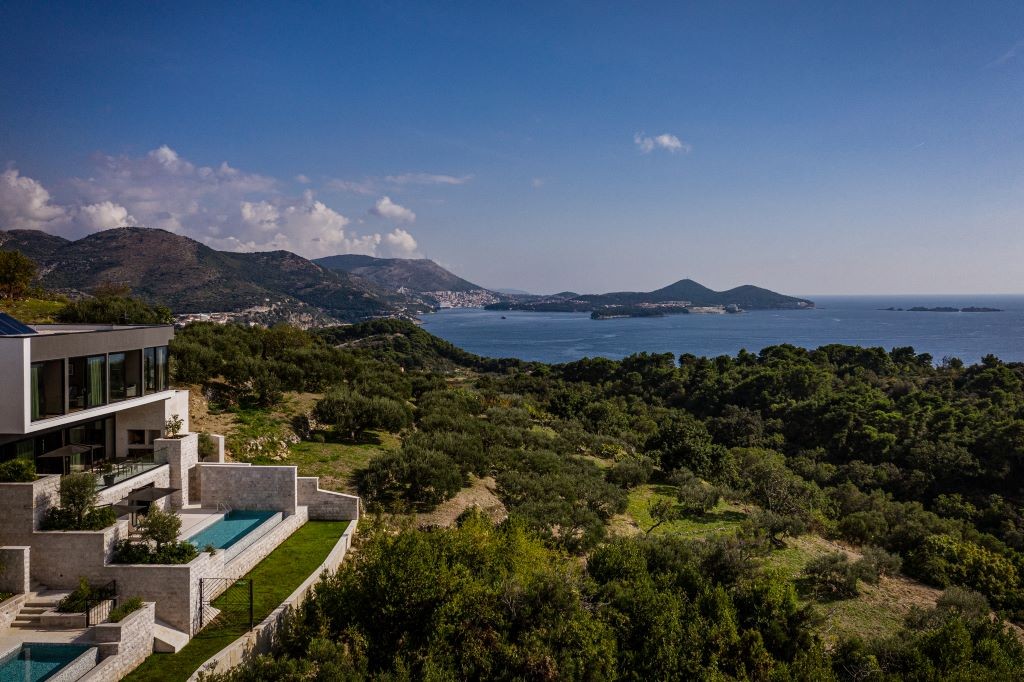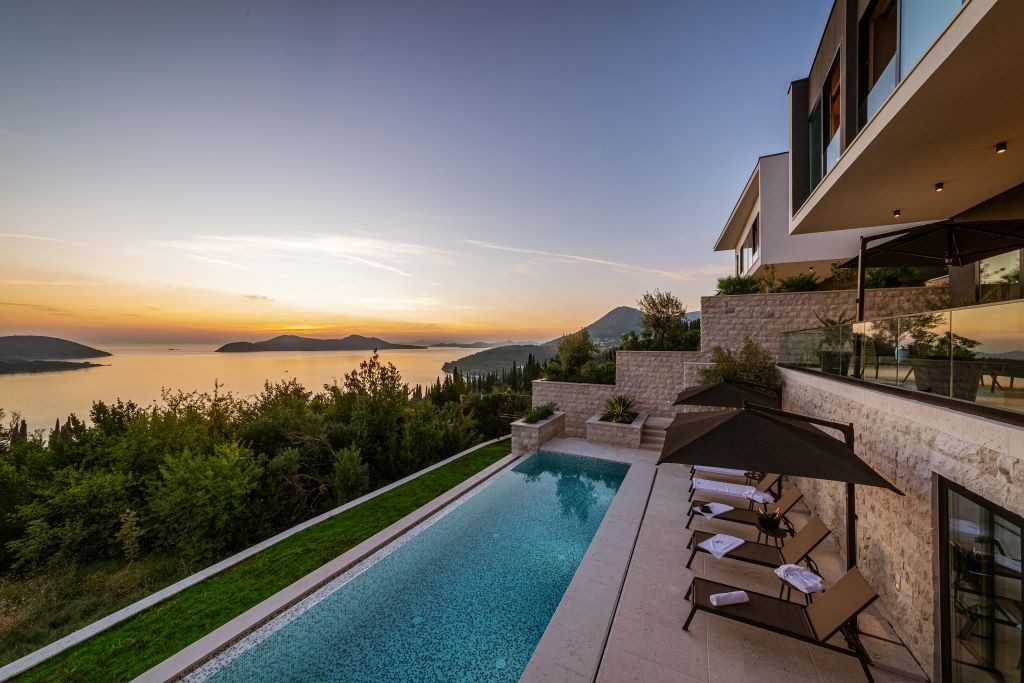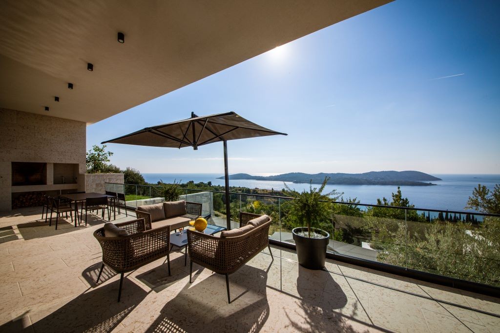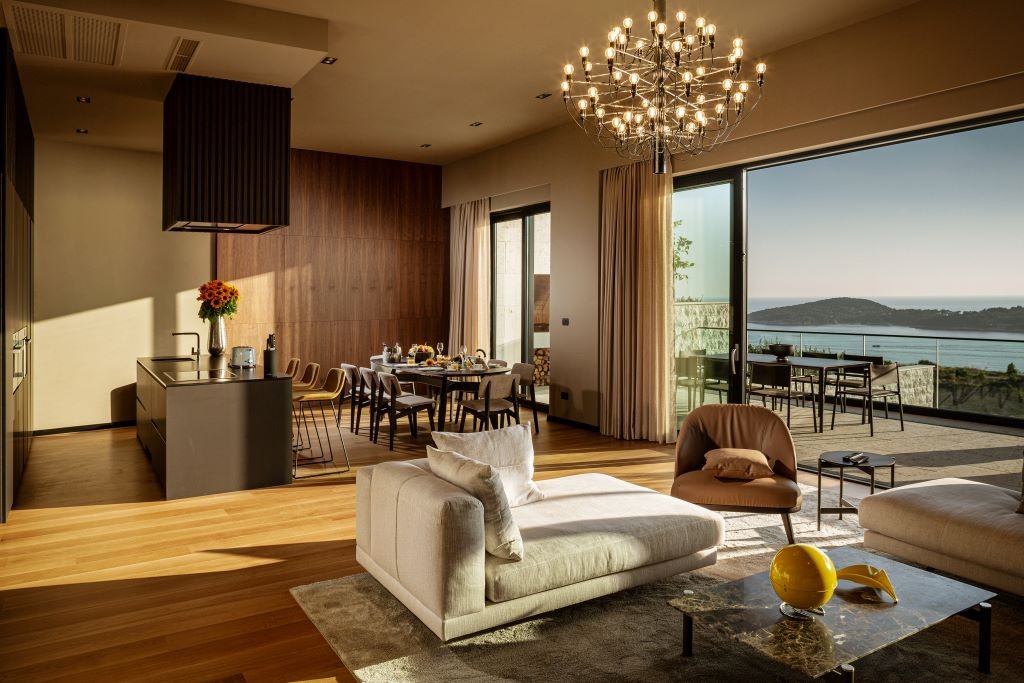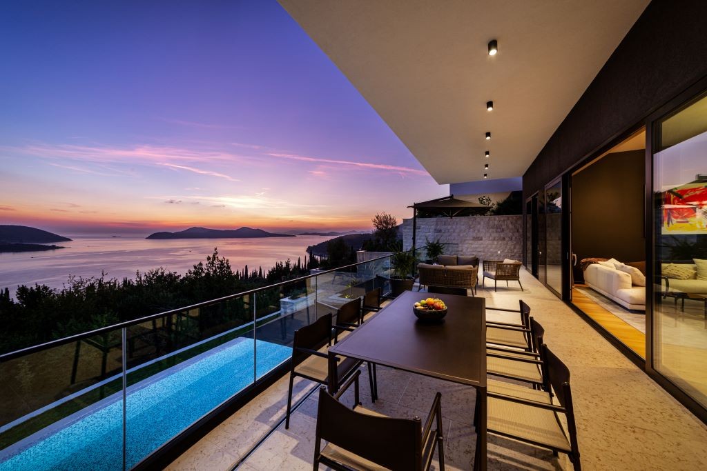 This luxury villa spans 390 square meters across two floors and offers accommodation for up to 10 guests in five stylish en-suite bedrooms, each with a flat-screen TV and a private balcony overlooking the sea. The villa features a modern, fully equipped kitchen, a spacious open-plan living and dining area with floor-to-ceiling windows, and direct access to a terrace with breathtaking views of the Adriatic Sea and the Dubrovnik archipelago.