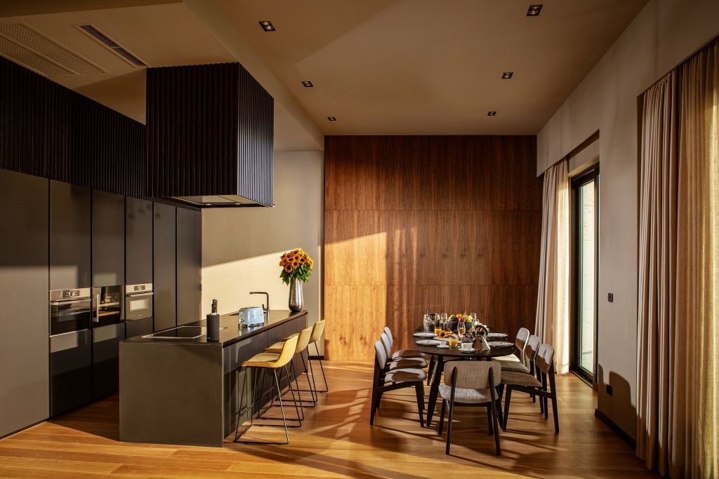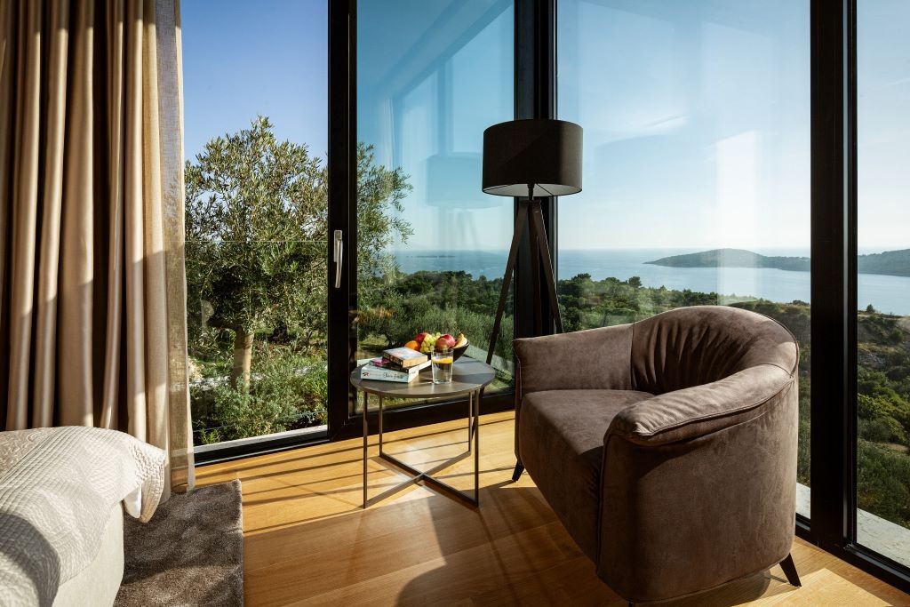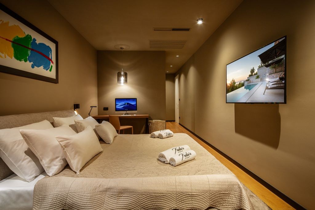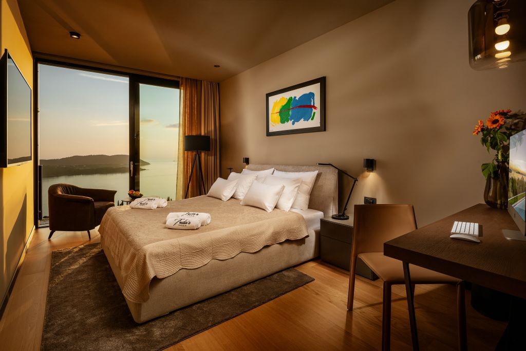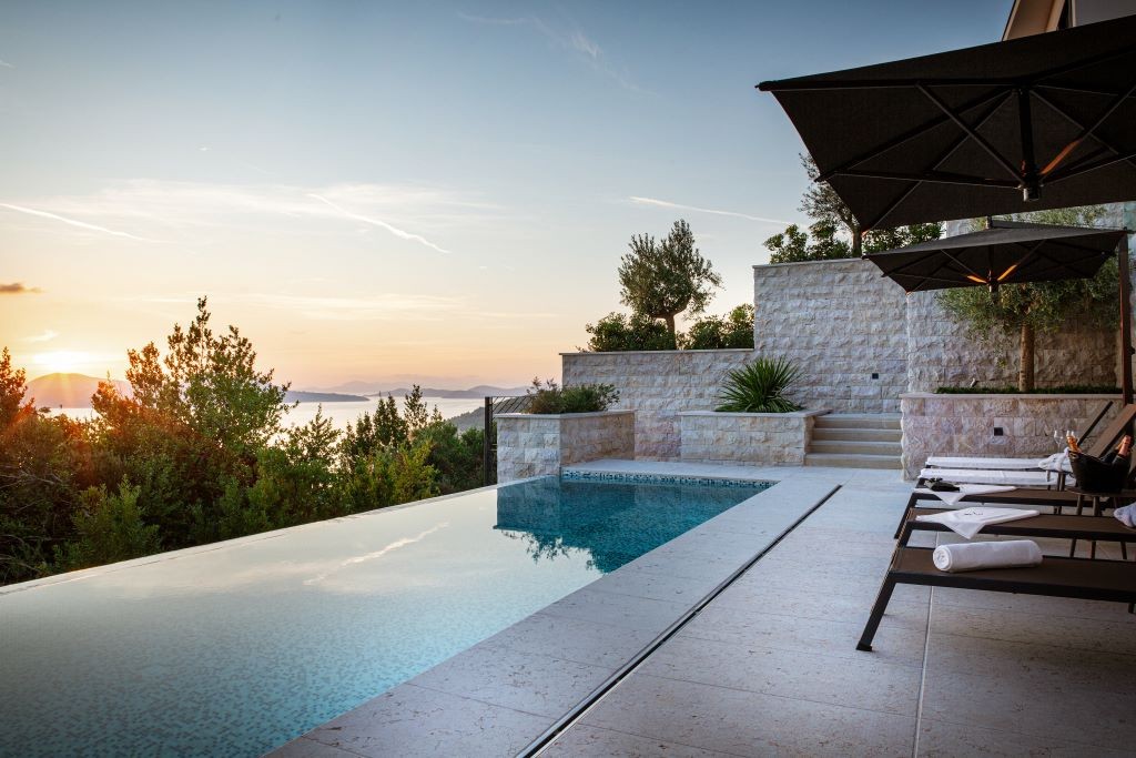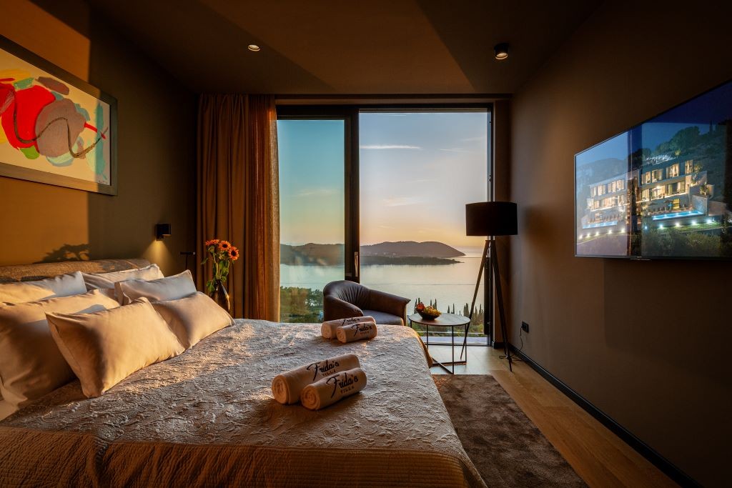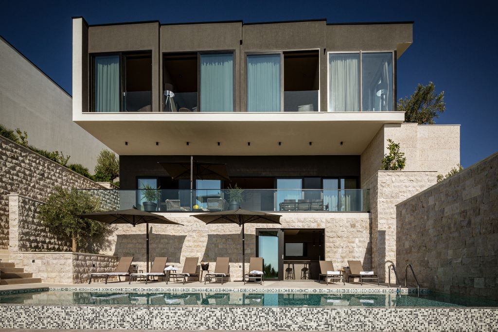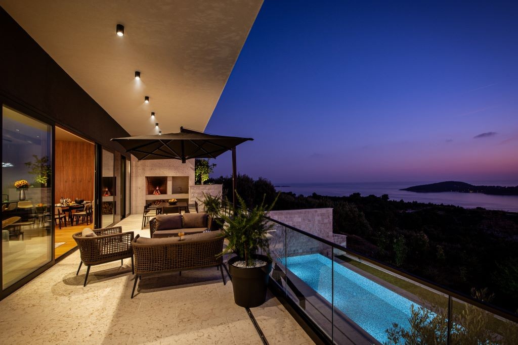 This luxury villa spans 390 square meters across two floors and offers accommodation for up to 10 guests in five stylish en-suite bedrooms, each with a flat-screen TV and a private balcony overlooking the sea. The villa features a modern, fully equipped kitchen, a spacious open-plan living and dining area with floor-to-ceiling windows, and direct access to a terrace with breathtaking views of the Adriatic Sea and the Dubrovnik archipelago.