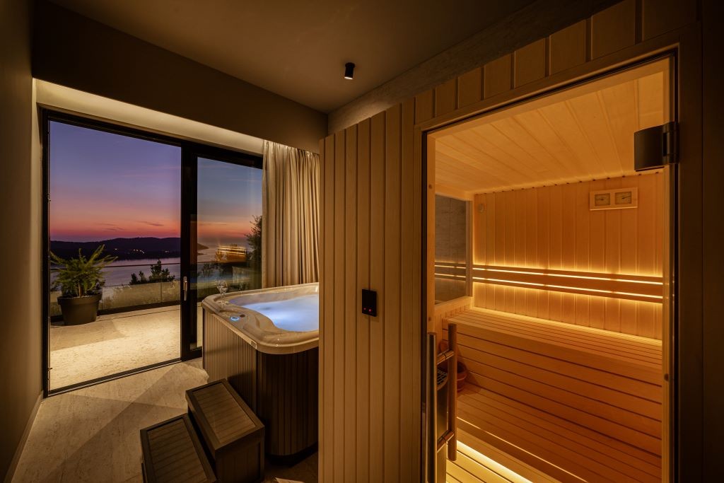 Guests can relax on the south-facing terrace with an outdoor fireplace and alfresco dining area, or enjoy the heated infinity swimming pool with sunbeds and an outdoor shower. For complete relaxation and comfort, the villa also includes a Finnish sauna and a Jacuzzi, providing a truly luxurious retreat in a peaceful coastal setting.